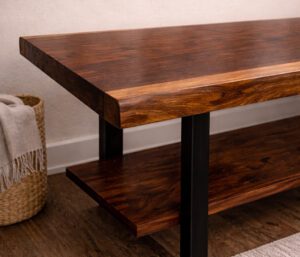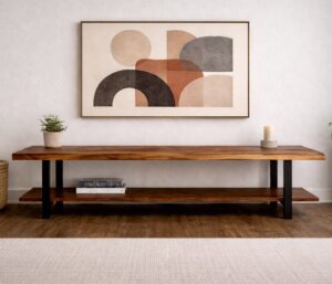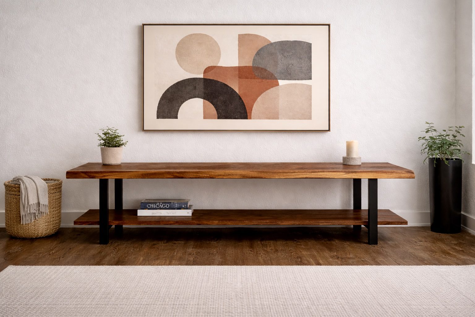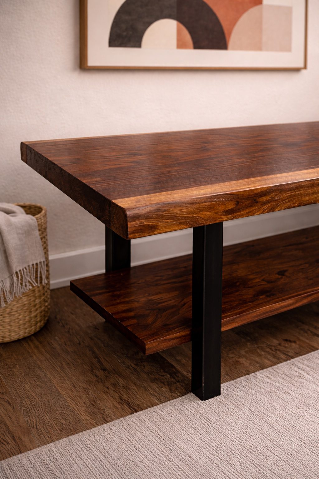 Crafted from solid hardwood, the live edge top preserves the organic contour of the tree — highlighting the unique grain, movement, and individuality of each slab. Paired with clean steel legs and a lower shelf for added function, the design balances raw texture with architectural structure.