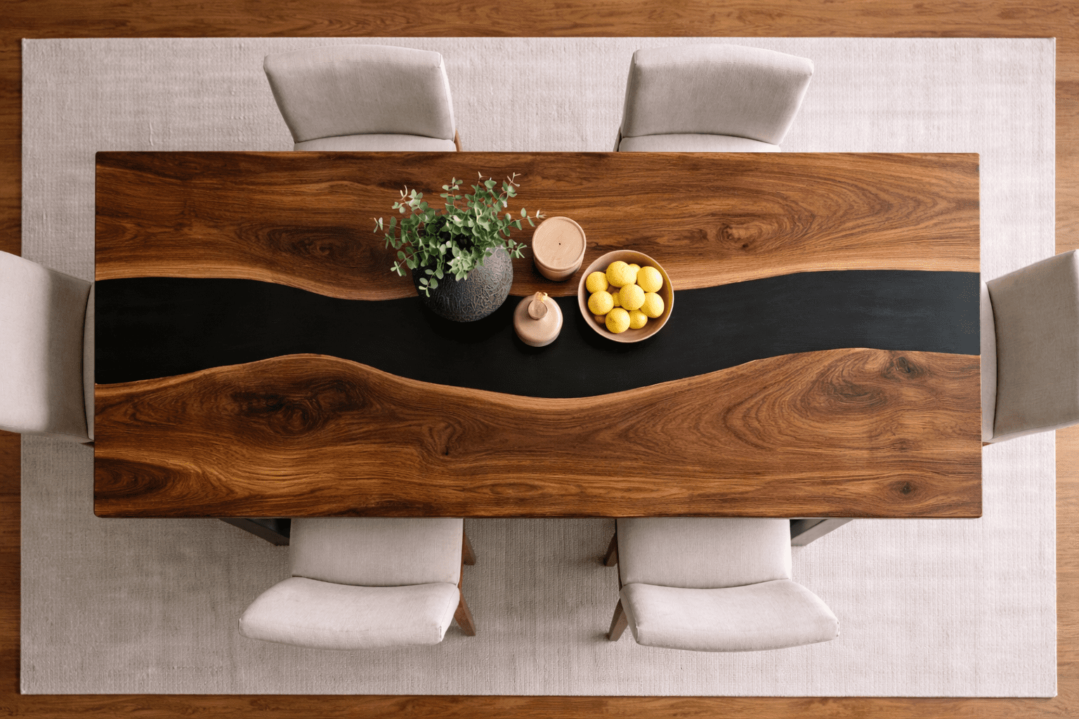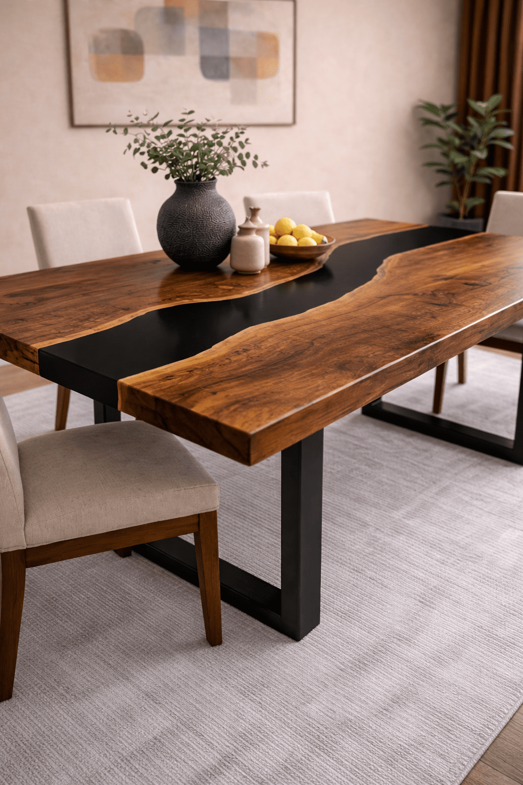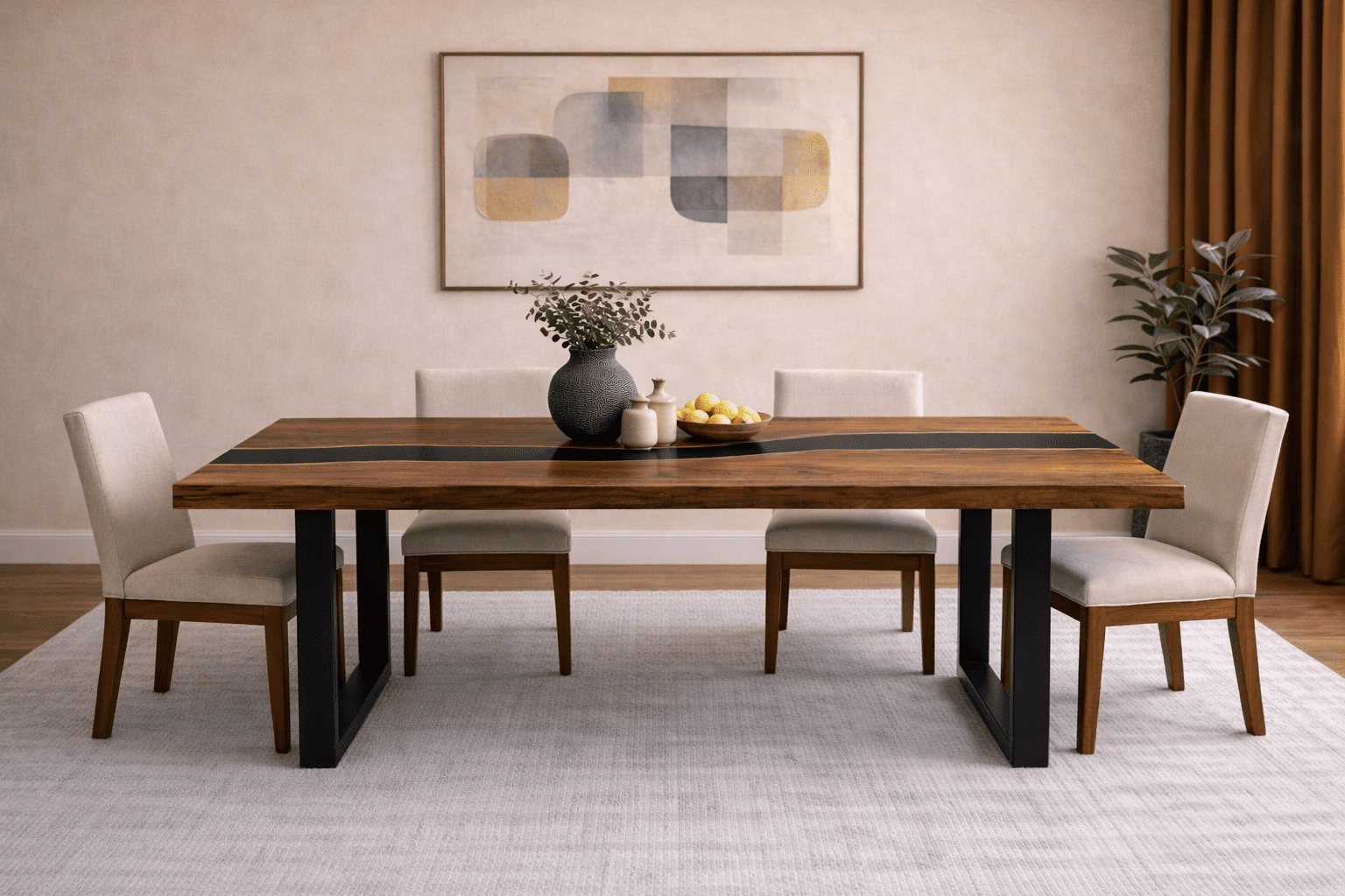 The Fulton Dining Table combines live edge hardwood slabs with a bold epoxy river to create a striking, one-of-a-kind design. Natural grain patterns and organic edges bring warmth and movement, while the dark epoxy center adds depth and contrast. Supported by clean steel legs and built by hand in Chicago, each piece is made to order and designed to make a statement in any dining space.